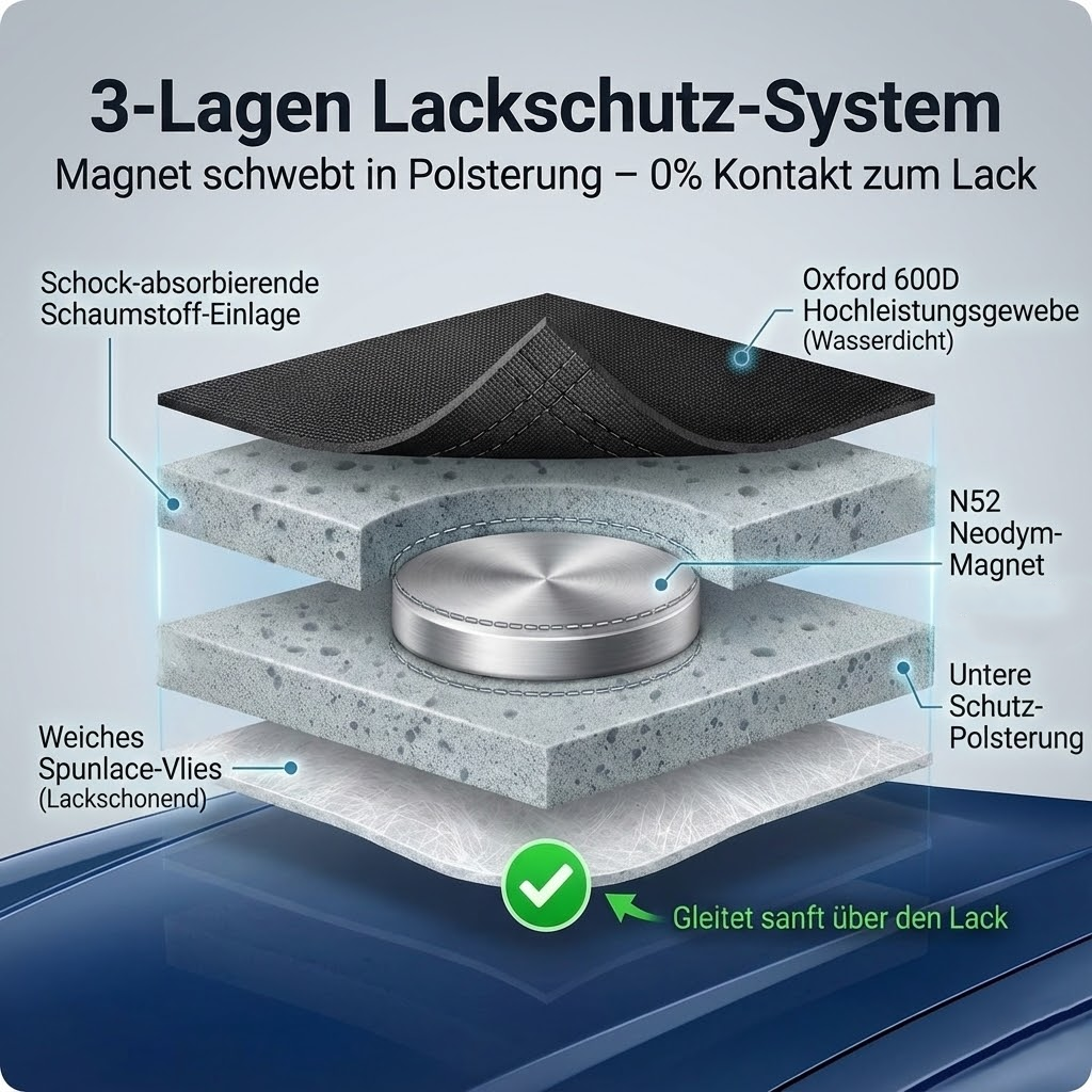 Während herkömmliche Magnete direkt auf dem Lack scheuern, ‚schwebt‘ unser N52-Kern in einer doppelten Polsterung. 100% Haftkraft, 0% Kratzrisiko.